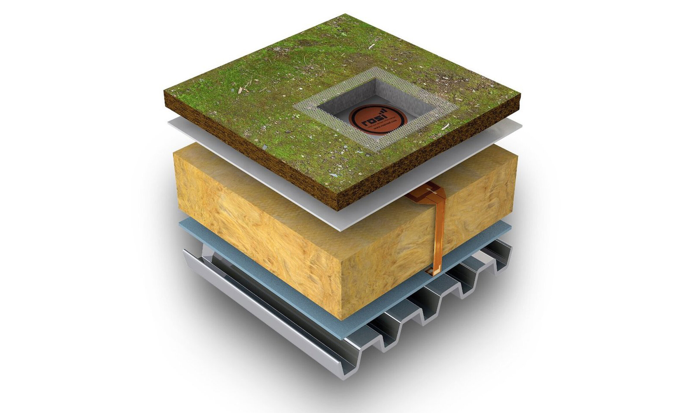 Mit der hochpräzisen R.O.S.I.-Sensortechnik können wir jederzeit den Zustand des Dachschichtenpakets eines Flachdachs überwachen: Dabei wird der Sensor auf der Dampfsperre platziert, die zugehörige Sensor-Antenne wird direkt unter der Abdichtung installiert.