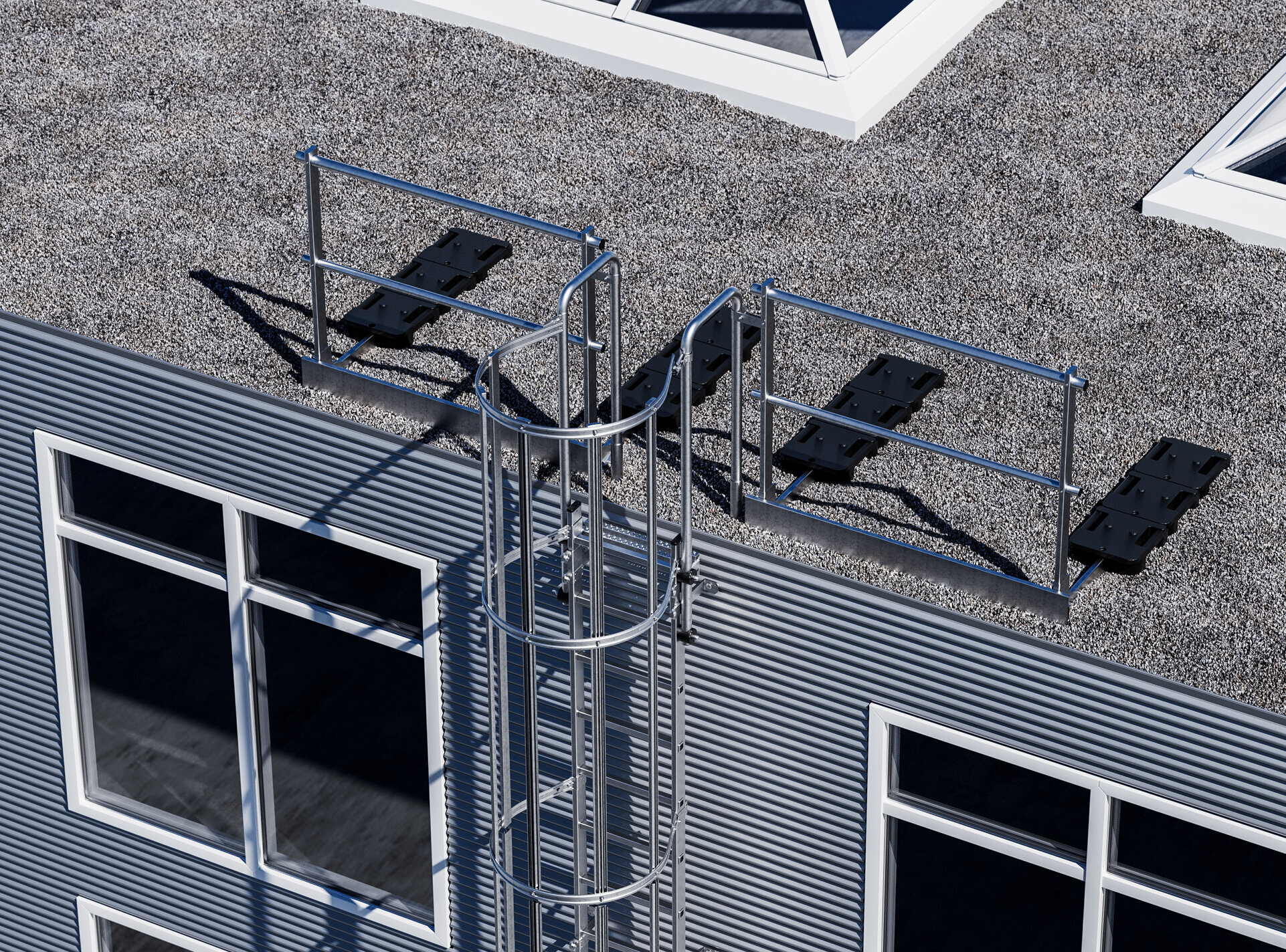 Sicher aufs Dach kommen und sicher dort arbeiten können: Wir installieren für Sie den geeigneten Aufstieg und passende Geländer für die gebotene Arbeitssicherheit auf dem Dach.